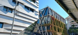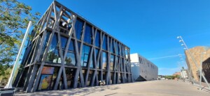 La tour emblématique, revêtue d’aluminium et de verre, abrite un centre d’art contemporain avant-gardiste au cœur du Parc des Ateliers.