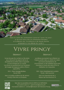 Dans le cadre de l’évènement national « Levez les yeux », la Maison de l’architecture de Haute Savoie, en partenariat avec le service Ville d’art et d’Histoire d’Annecy, proposent aux élèves des écoles primaires deux séances dont une visite architecturale sur la commune de Pringy avec un guide conférencier et une séance avec des ateliers en classes.